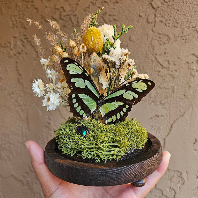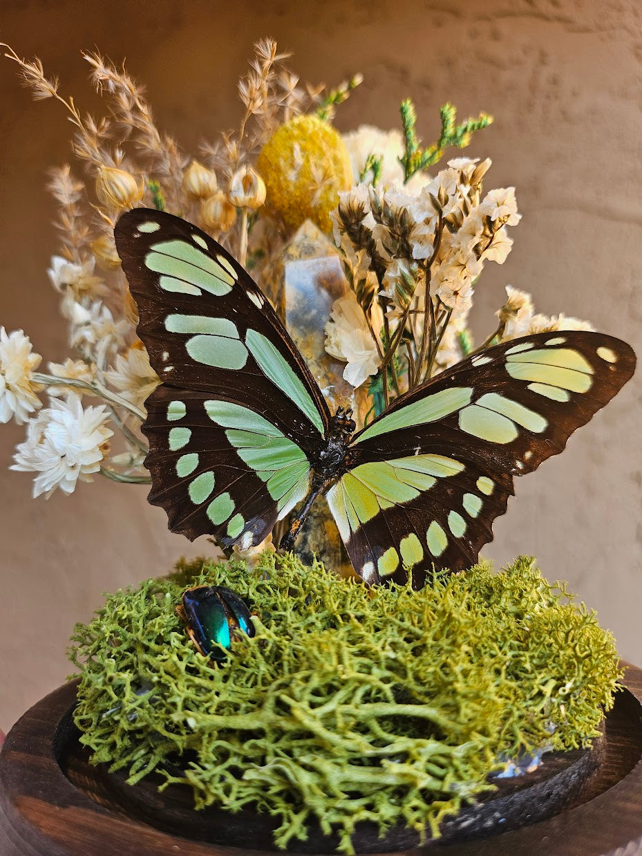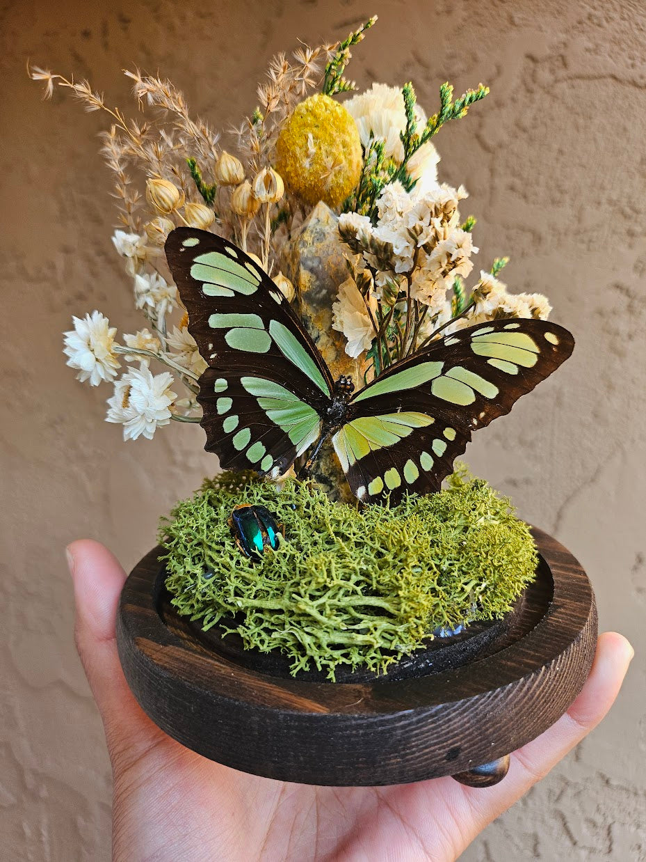 A philaethria dido butterfly with various florals and a crystal tower in a glass dome.
