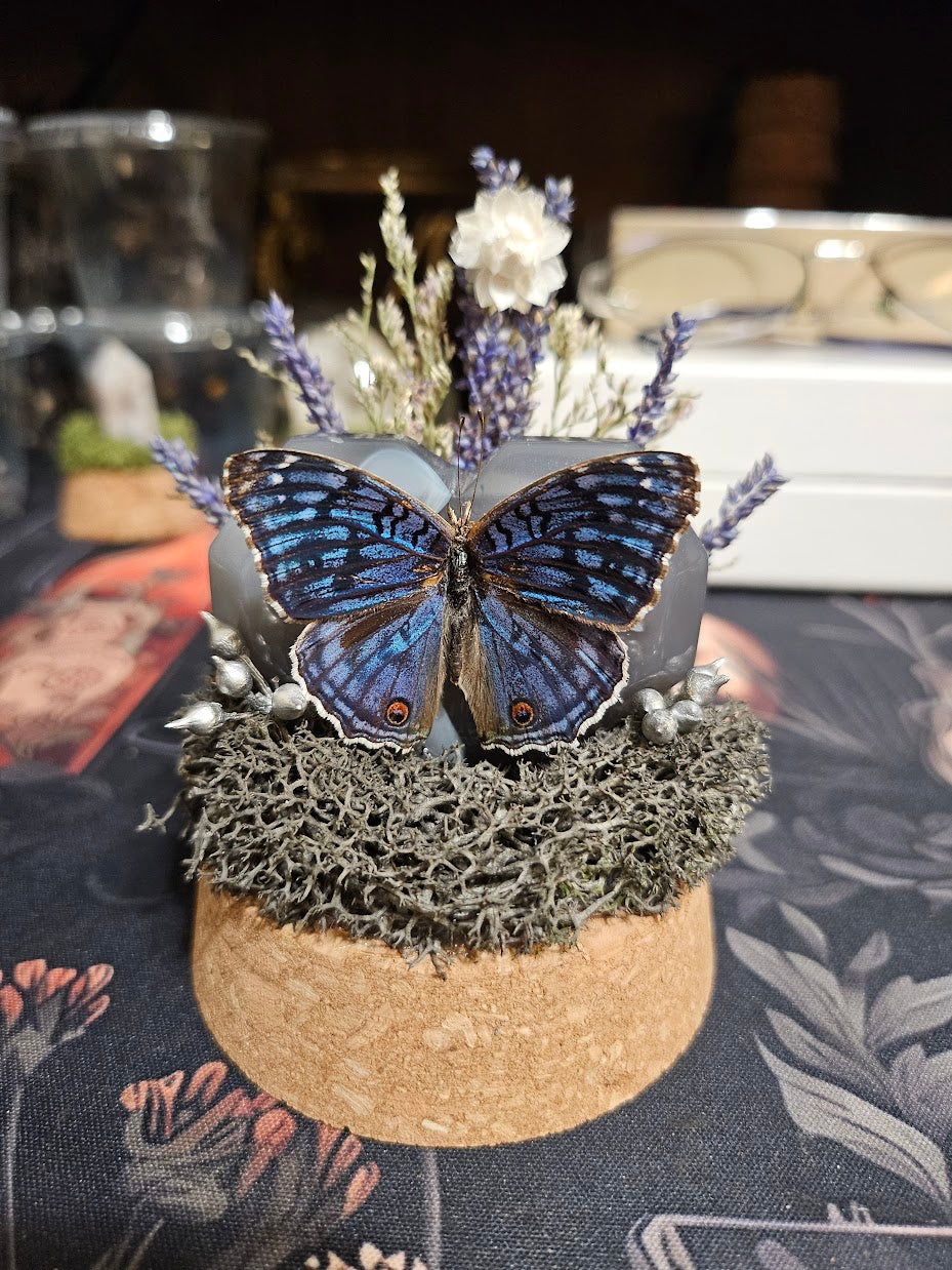 A junonia rhadama butterfly on a crystal heart with various florals in a glass dome.