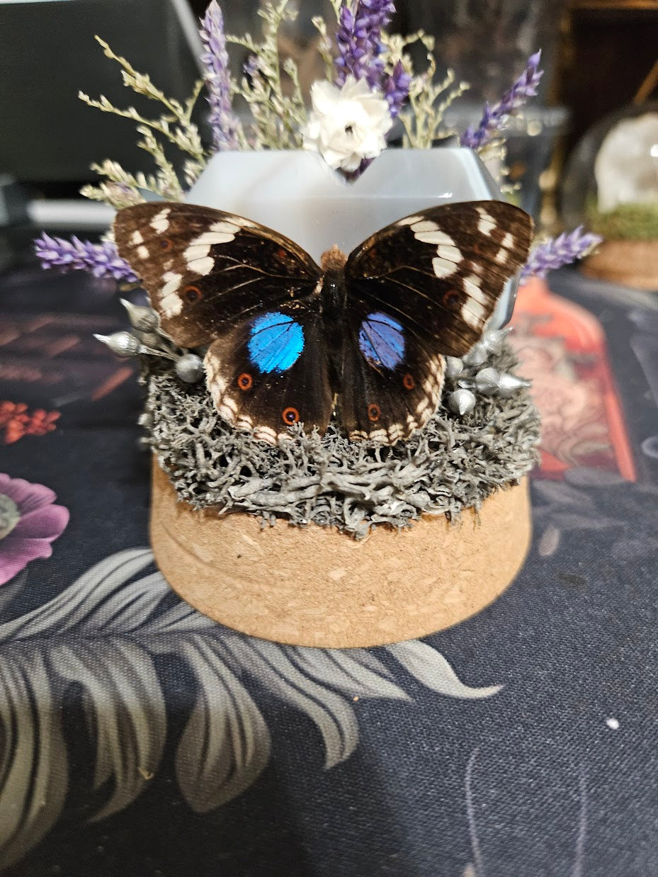 A junonia oenone butterfly on a crystal heart with various florals in a glass dome.