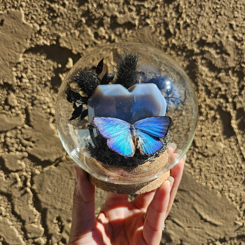 An arhopala araxes butterfly on a crystal heart with various florals in a glass dome.