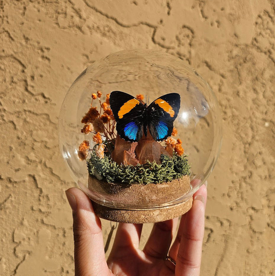 A callicore aegina butterfly on a tangerine crystal cluster with various florals in a glass dome.